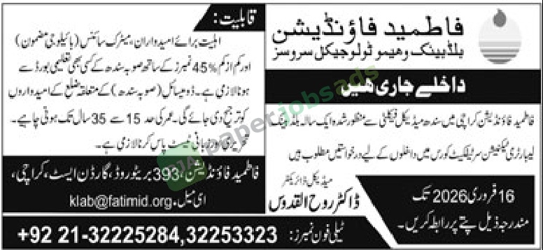 فاطمید فاؤنڈ یشن کراچی میں سندھ میڈ یکل فیکلٹی سے منظور شدہ ایک سالہ بلڈ ایک کو ترجیح دی جائے گی۔ عمر کی حد 15 سے 35 سال تک ہوتی چا ہے۔