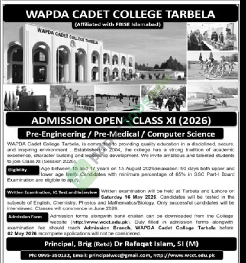 examination fee should reach Admission Branch, WAPDA Cadet College Tarbella before