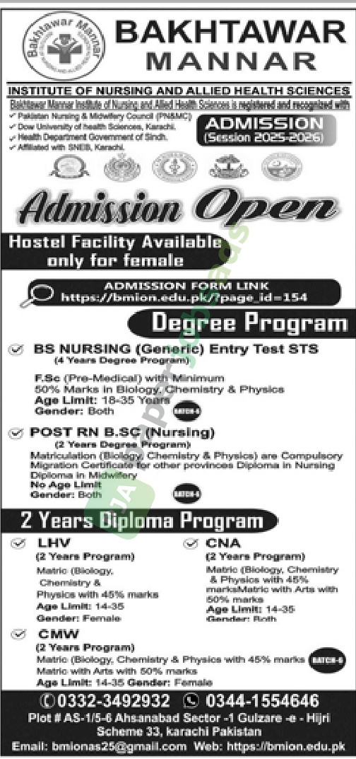 Admissions for undergraduate programs have been opened by Bakhtawar Mannar Institute of Nursing (BMION). Originally published in Daily Jang on 1 February 2026.