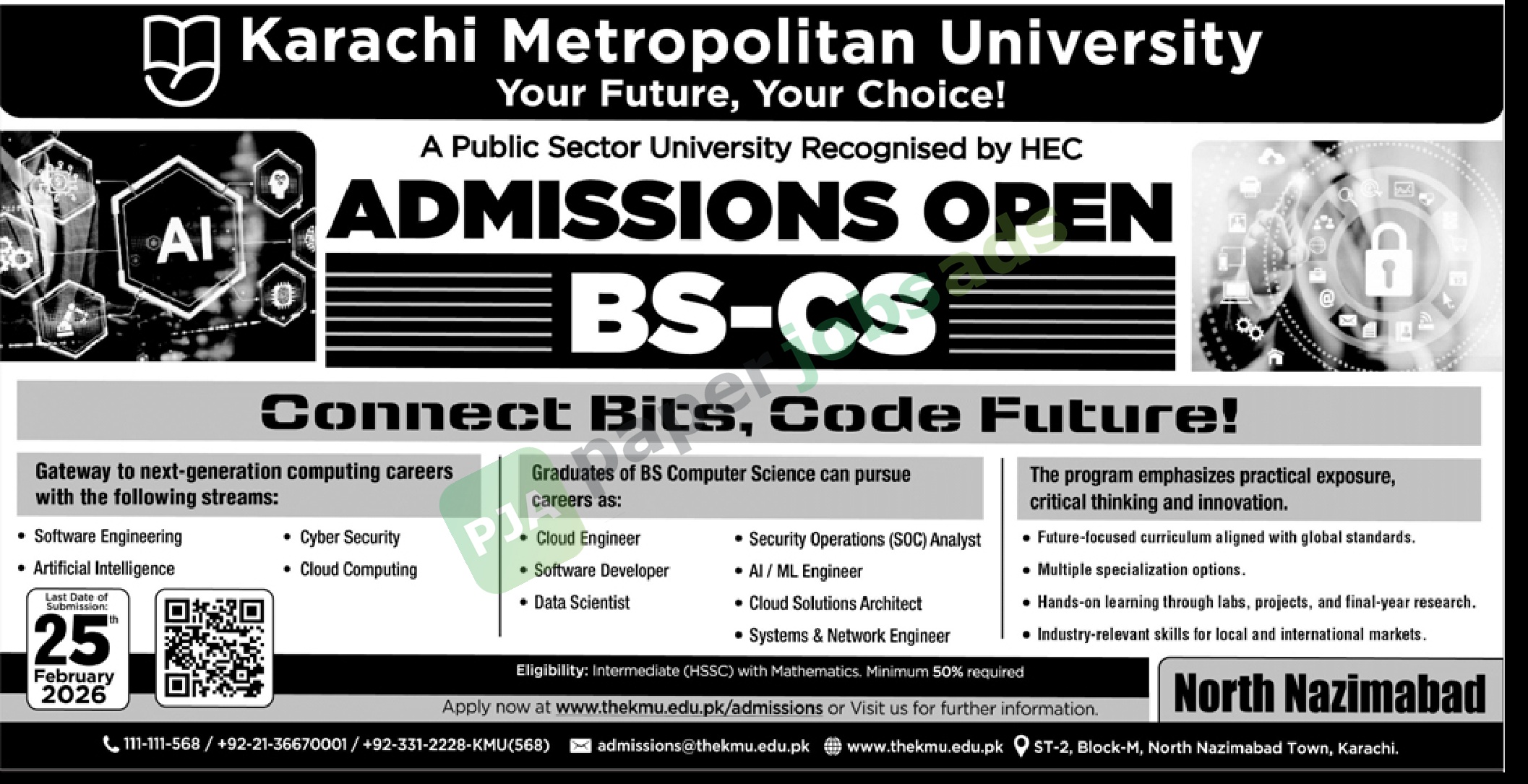 Admissions for undergraduate programs have been opened by Karachi Metropolitan University. Originally published in Daily Jang on 1 February 2026.