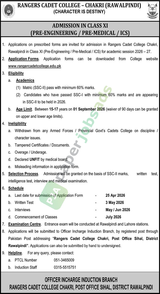1. Applications on prescribed forms are invited for admission in Rangers Cadet College Chakri,