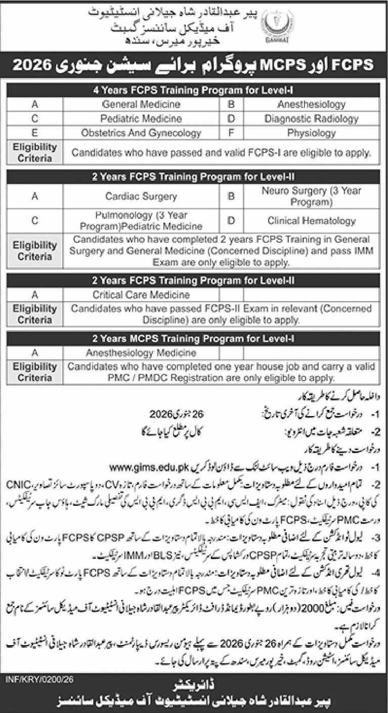 Admissions for fcps programs have been opened by PIR ABDUL QADIR SHAH JEELANI INSTITUTE OF MEDICAL SCIENCES. Originally published in Daily Jang on 21 January 2026.