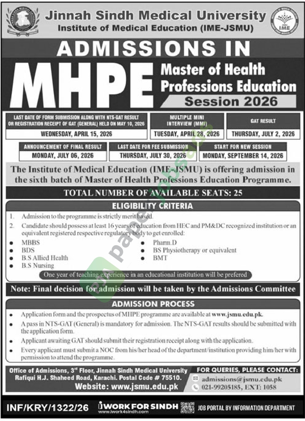 Application form and the prospectus of MHPE programme are available at www.jsmu.edu.pk.