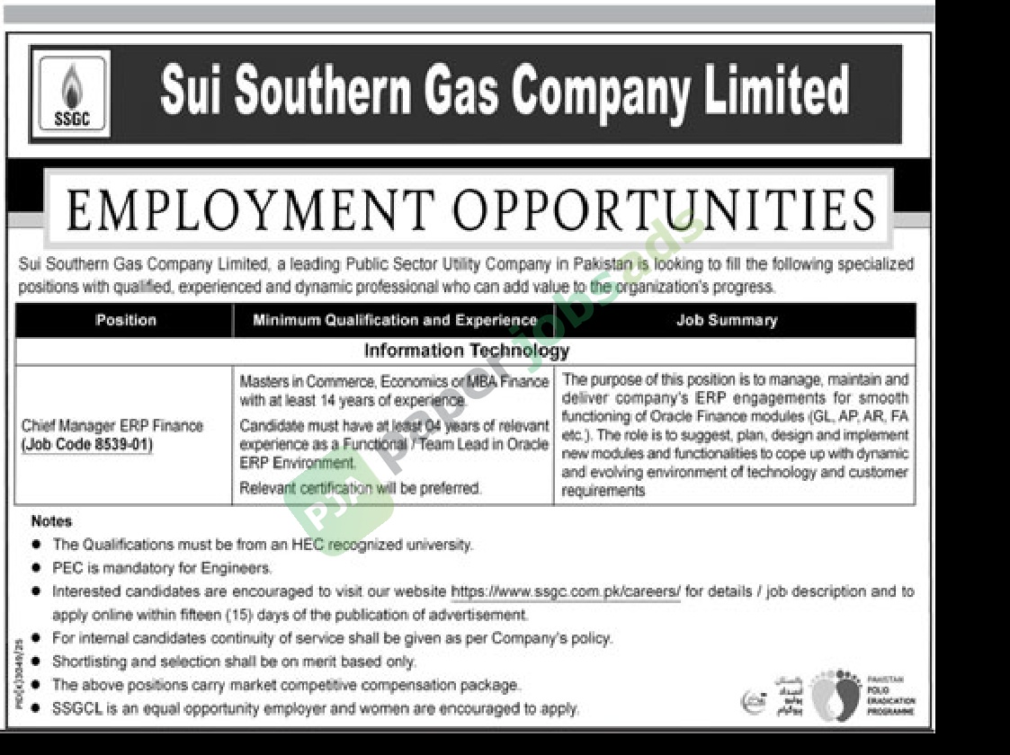 Interested candidates are encouraged to visit our website https://www.ssgc.com.pk/careers/ for details / job description and to