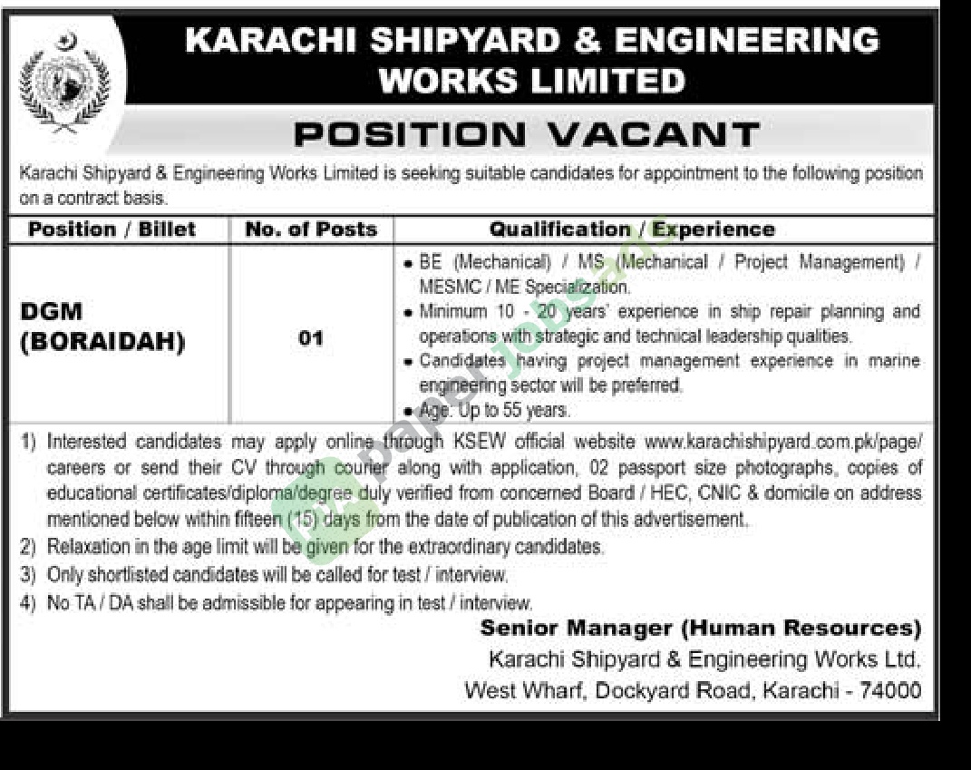 Karachi Shipyard & Engineering Works Limited is seeking suitable candidates for appointment to the following position