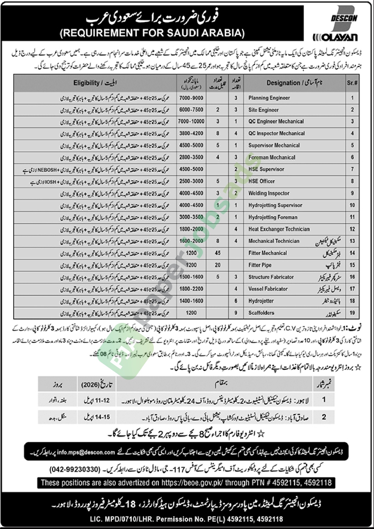 A contract international sector job vacancy for the position of Engineer has been announced in Saudia Arabia. Originally published in Daily Jang on 5 April 2026.