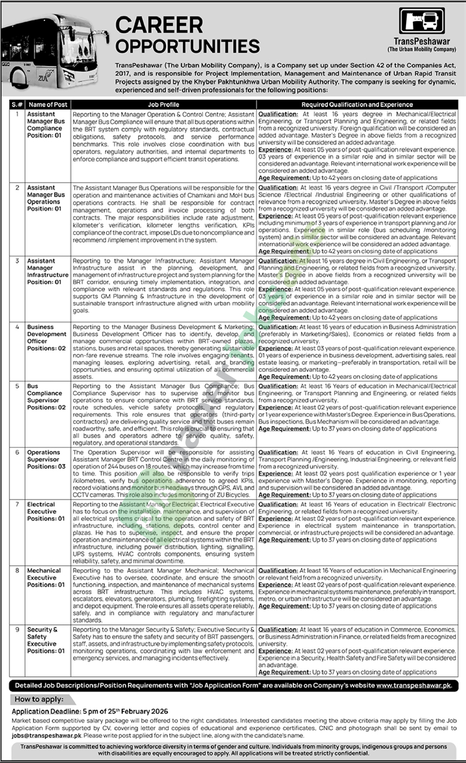 Detailed Job Descriptions/Position Requirements with “Job Application Form” are available on Company’s website www.transpeshawar.pk.