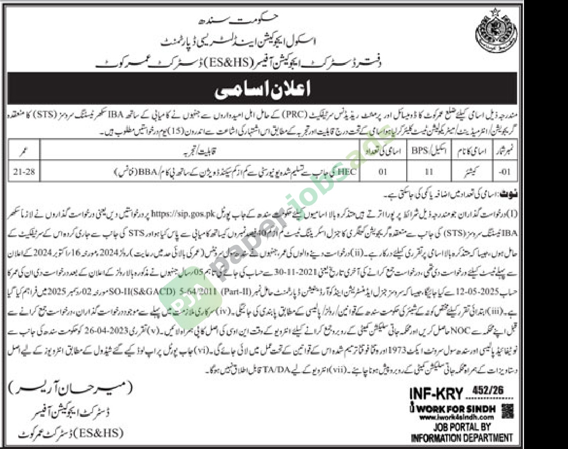 مندرجہ ذیل اسامی کیلئے ضلع عمرکوٹ کا ڈومیسائل اور پر منٹ ریذیڈنس سرٹیفکیٹ (PRC) کے حامل اہل امیدواروں سے جنہوں نے کامیابی کے ساتھ IBA سکھر ٹیسٹنگ سروسز (STS) کا منعقدہ