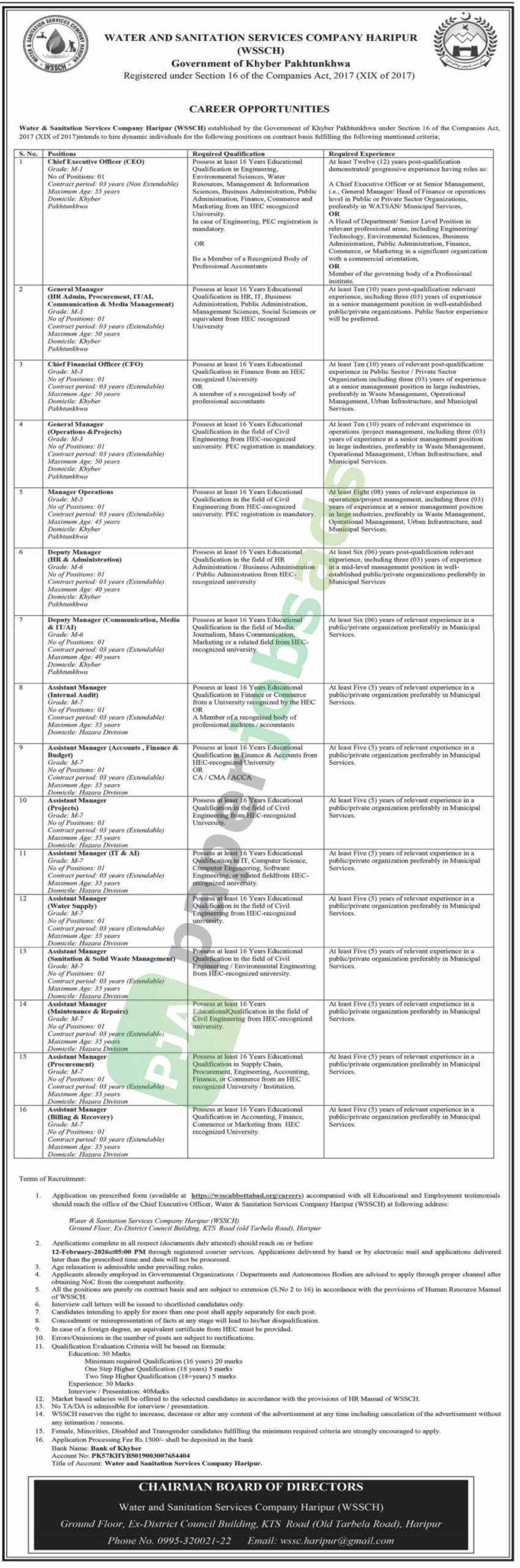 Application on prescribed form (available at https://wsscabbottabad.org/careers) accompanied with all Educational and Employment testimonials