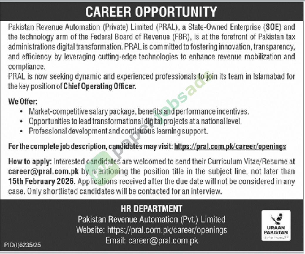 Job Vacancy – Chief Operating Officer – Pakistan Revenue Automation (Private) Limited (PRAL) – Islamabad