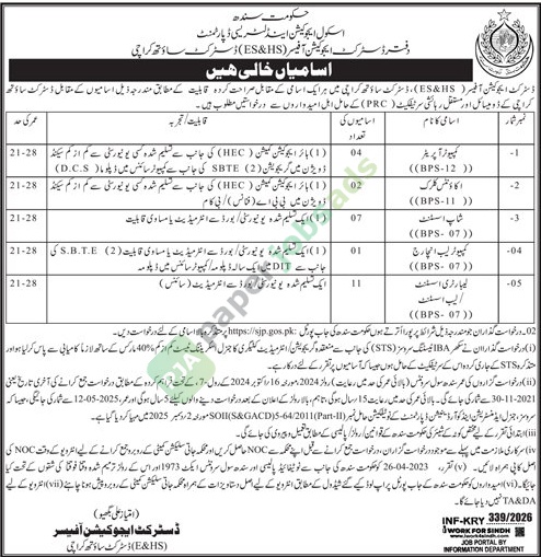 Job Vacancy - Computer Operator / Accounts Clerk / Shop Assistant / Computer Lab Incharge / Computer Lab Assistant - Karachi - School Education & Literacy Department