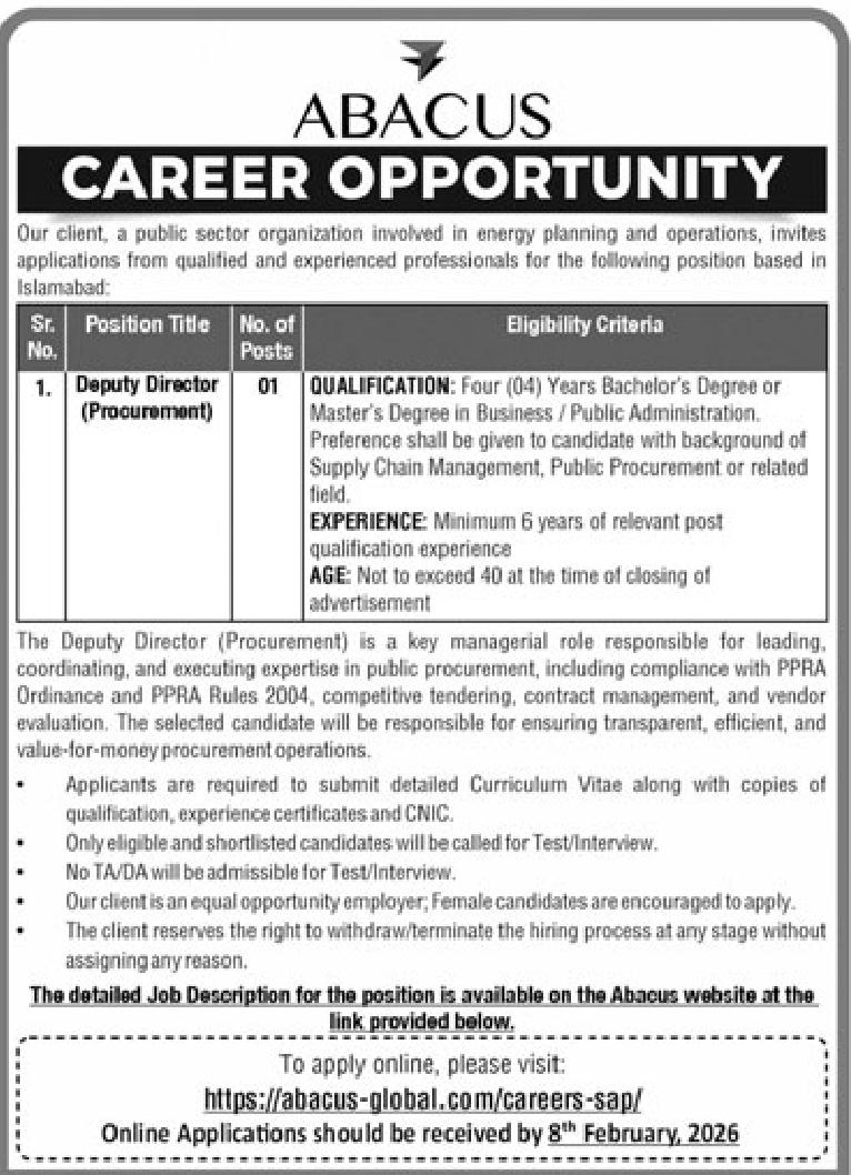 Islamabad Published: 26 Jan 2026 Deadline: 08 Feb 2026