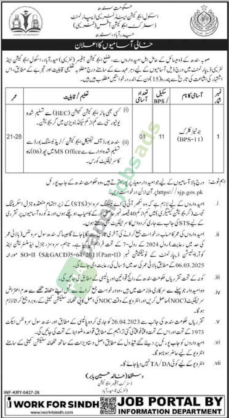Job Vacancy – Junior Clerk – Sindh