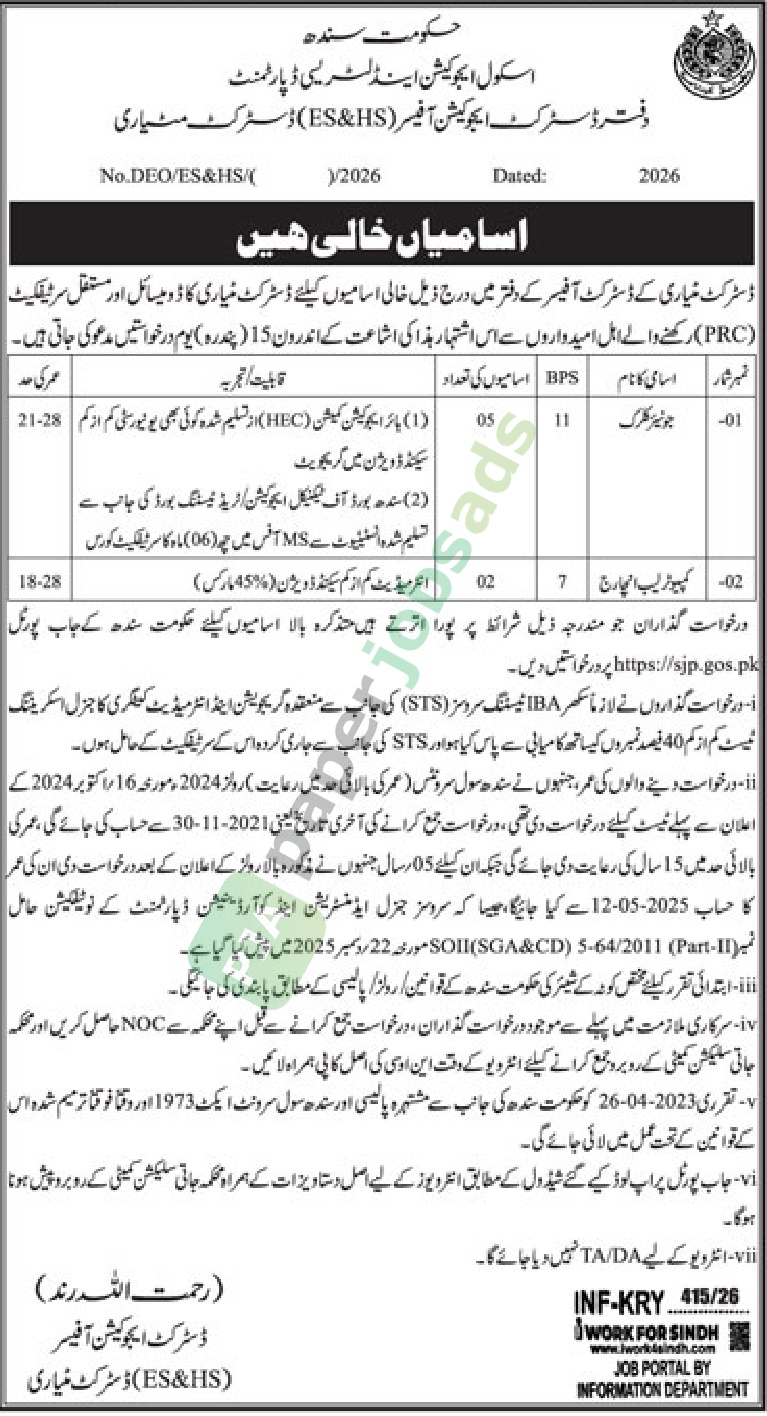 ڈسٹرکٹ تیاری کے ڈسٹرکٹ آفیسر کے دفتر میں درج ذیل خالی اسامیوں کیلئے ڈسٹرکٹ میاری کا ڈومیسائل اور مستقل سرٹیفکیٹ