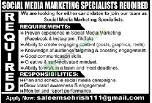 Job Vacancy – Marketing – SOCIAL MEDIA MARKETING SPECIALISTS REUQIRED