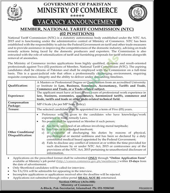professionals against Two (02) positions of Member, National Tariff Commission (NTC). The aspiring