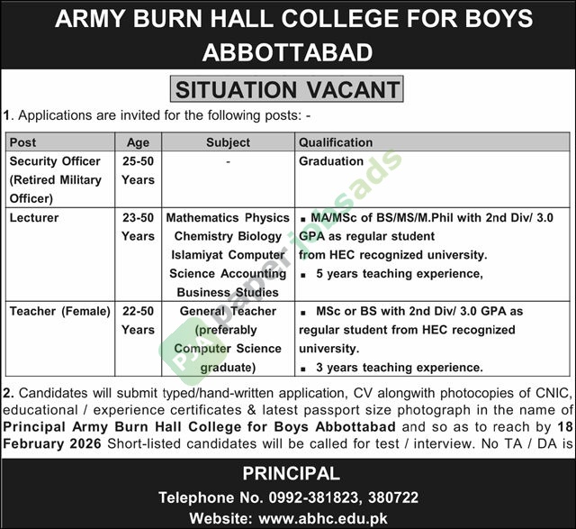 Job Vacancy - Security Officer / Lecturer / Teacher - ARMY BURN HALL COLLEGE FOR BOYS
