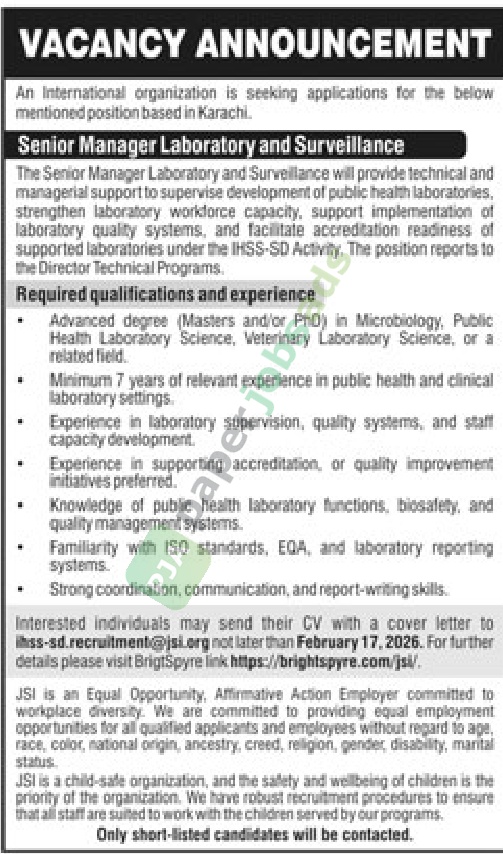 Job Vacancy – Senior Manager Laboratory and Surveillance – Karachi