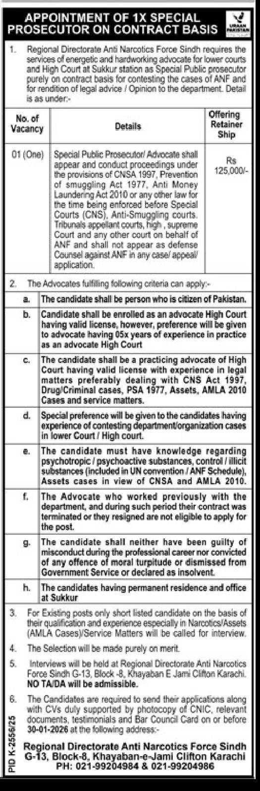 A contract government sector job vacancy for the position of Special Public Prosecutor has been announced in Karachi. Originally published in Daily Jang on 27 January 2026.