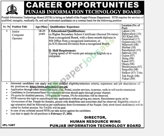 Junior Computer Operator Required - PUNJAB INFORMATION TECHNOLOGY BOARD