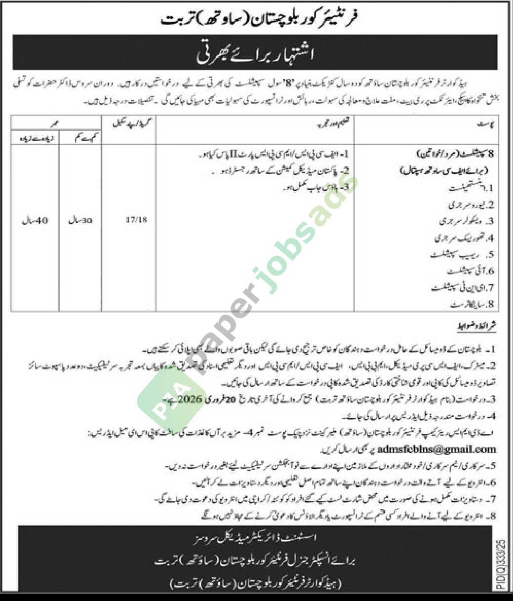 3 درخواست نام ہیڈ کوارٹر فرنٹیئر کور بلوچستان ساؤتھ تربت) جمع کروانے کی آخری تاریخ 20 فروری 2026 ہے۔