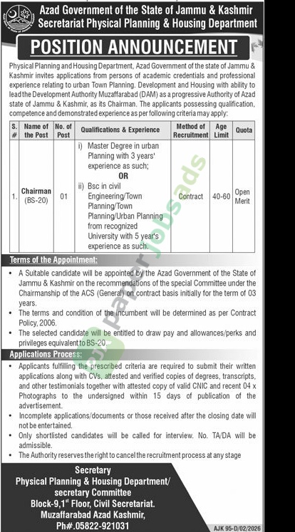 A contract government sector job vacancy for the position of Chairman has been announced in Muzaffarabad. Originally published in Daily Jang on 18 February 2026.