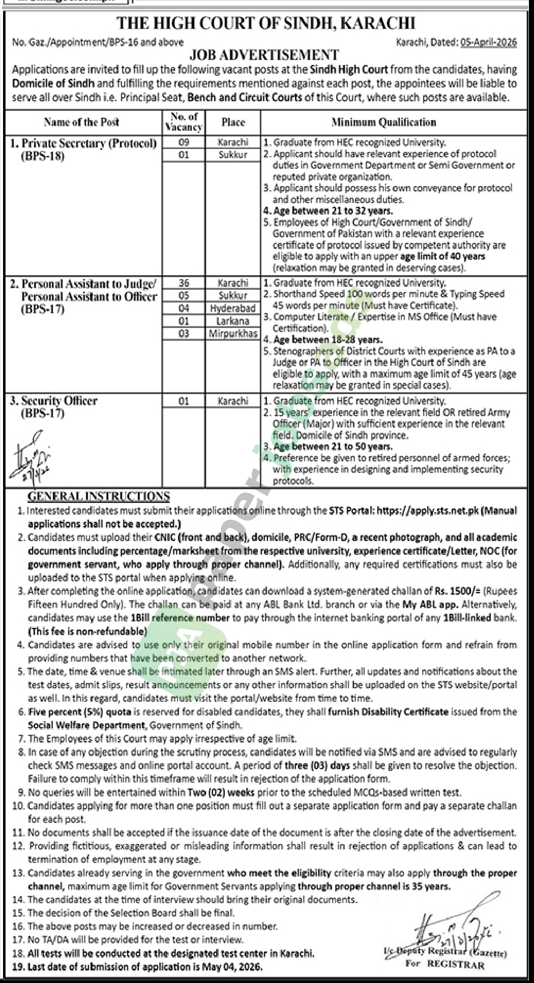 The last date to apply is 04 May 2026. Applications received after the deadline will not be entertained.