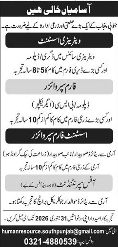 جنوبی پنجاب کے ایک بڑے صنعتی اور زرعی ادارہ کے لیے ضرورت ہے۔