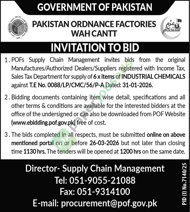 More Tenders from Pakistan Ordnance Factories