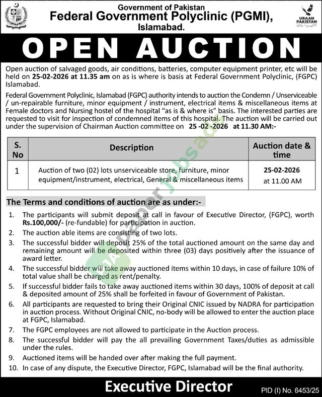 Federal Government Polyclinic, Islamabad (FGPC) authority intends to auction the Condemn / Unserviceable
