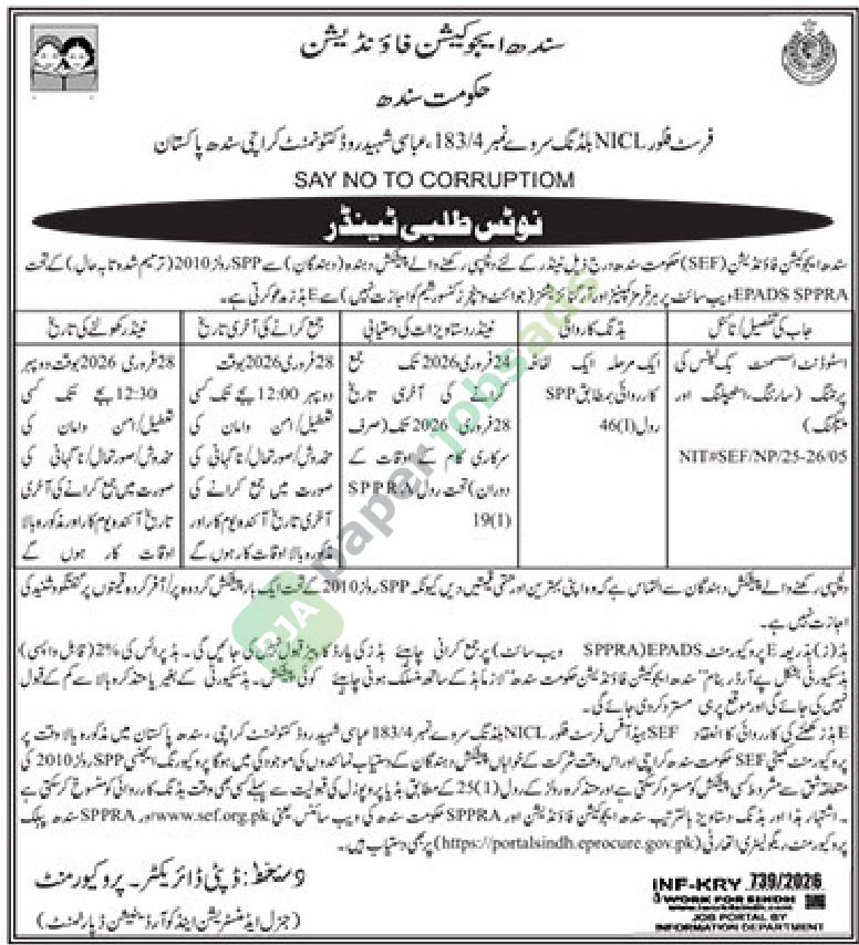 A semi-government tender notice has been issued by Sindh Education Foundation, Karachi. The bid submission deadline is 28 February 2026. Originally published in Daily Jang on 25 February 2026.