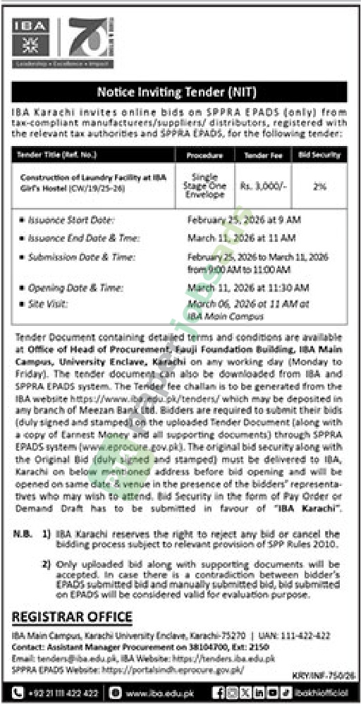 IBA Karachi invites online bids on SPPRA EPADS (only) from
