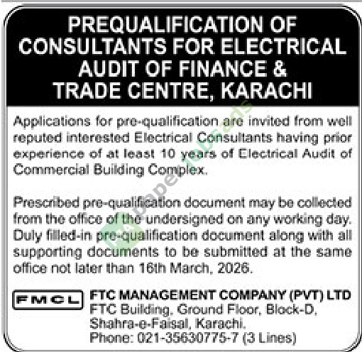 A private tender notice has been issued by FTC Management Company (Pvt.) Ltd, Karachi. The bid submission deadline is 16 March 2026. Originally published in Daily Jang on 4 March 2026.