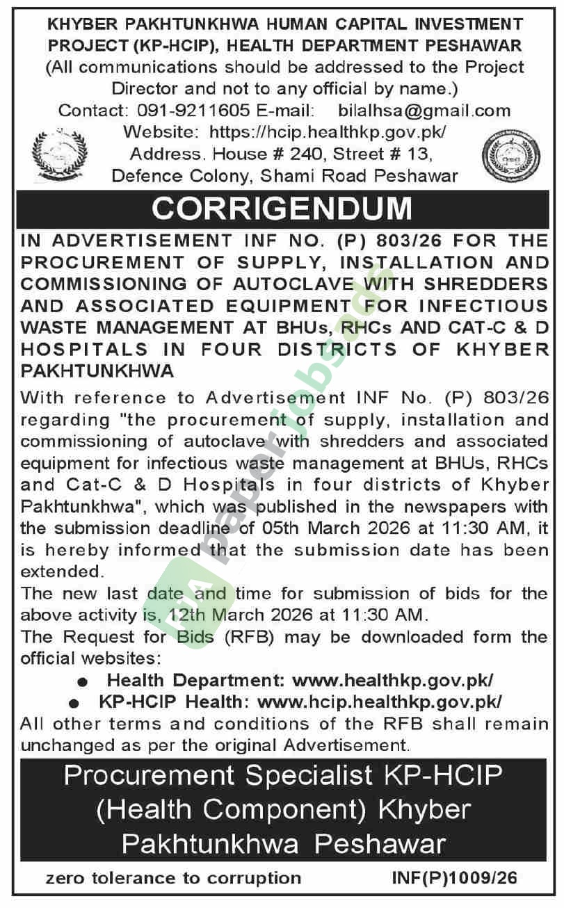 Corrigendum - Supply, Installation & Comissioning of Autoclave - HEALTH DEPARTMENT