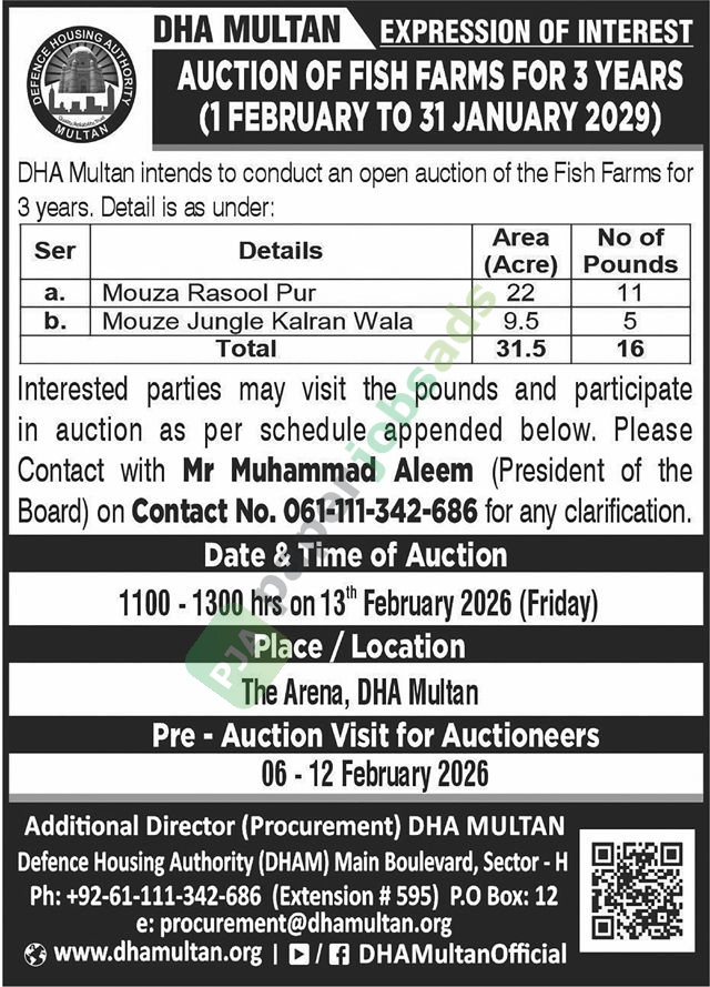 DHA Multan intends to conduct an open auction of the Fish Farms for