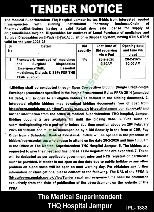A government tender notice has been issued by THQ Hospital, Jampur. The bid submission deadline is 28 February 2026. Originally published in The Nation on 7 February 2026.