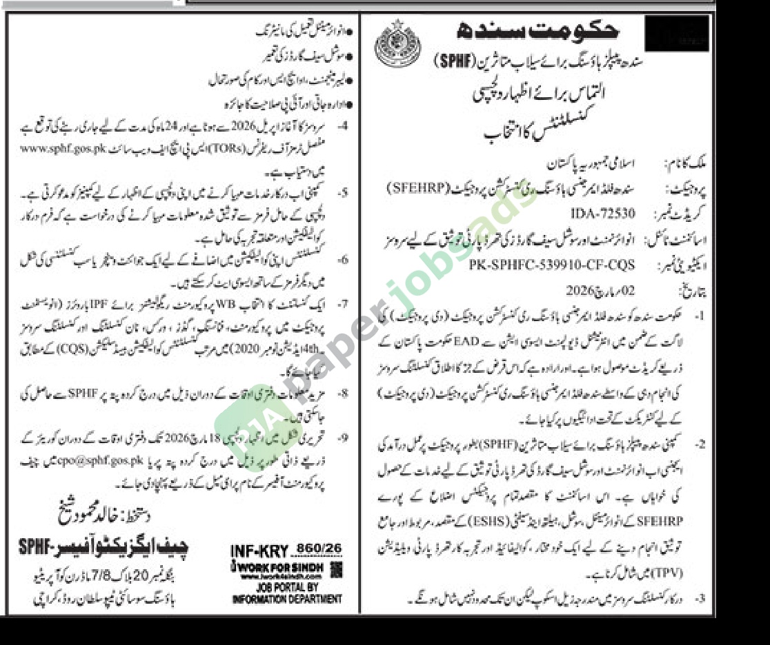 A government tender notice has been issued by Sindh Peoples Housing for Flood Affectees (SPHF), Karachi. The bid submission deadline is 18 March 2026. Originally published in Daily Jang on 3 March 2026.