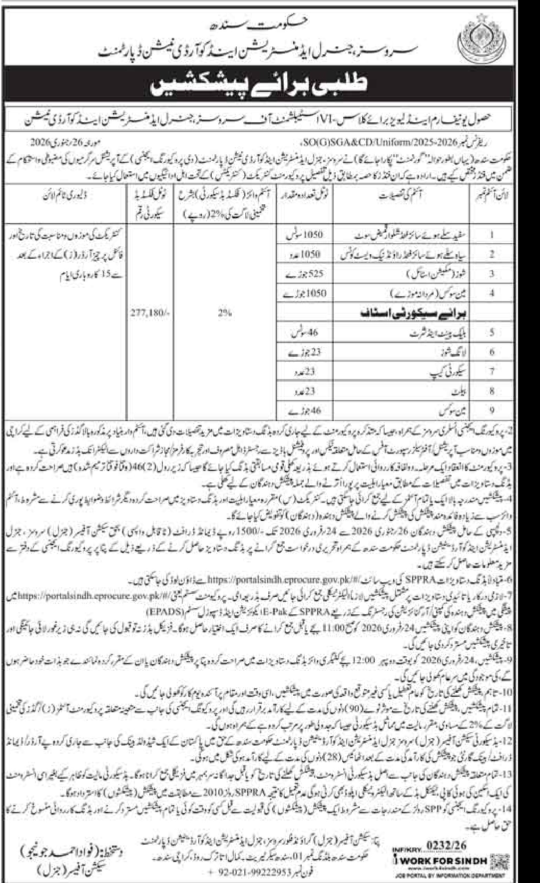 A government tender notice has been issued by Services General Administration and Coordination Department (SGA&CD), Karachi. Originally published in Daily Jang on 22 January 2026.