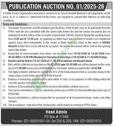A government tender notice has been issued by A Public Sector Organization announces auction for its Unser, Karachi. Originally published in Daily Jang on 31 January 2026.