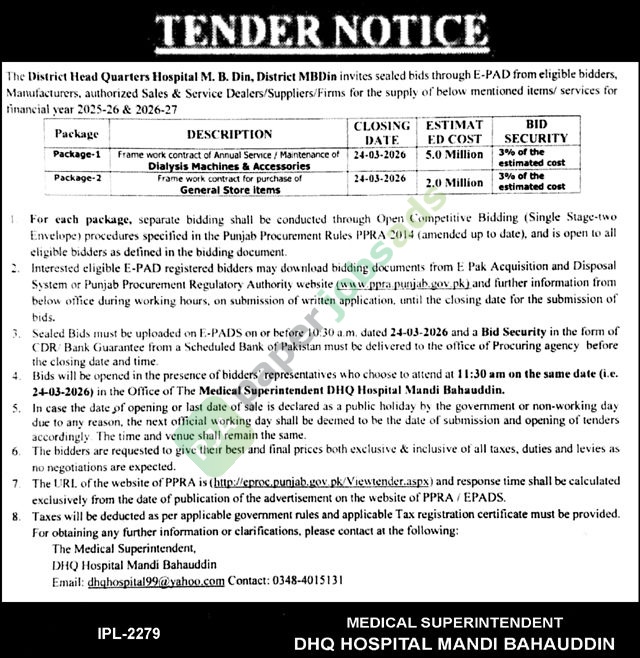 A government tender notice has been issued by District Head Quarters Hospital, Mandi Bahauddin. The bid submission deadline is 24 March 2026. Originally published in The Nation on 4 March 2026.