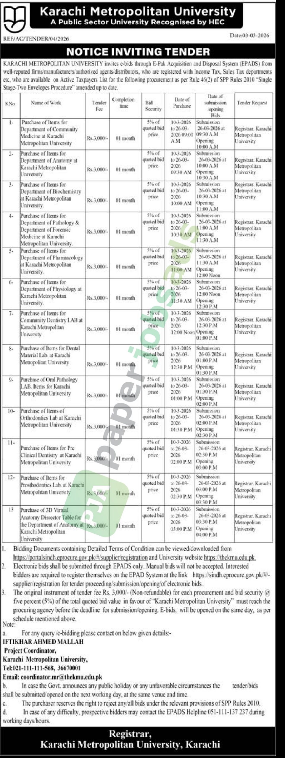 KARACHI METROPOLITAN UNIVERSITY invites e-bids through E-Pak Acquisition and Disposal System (EPADS) from