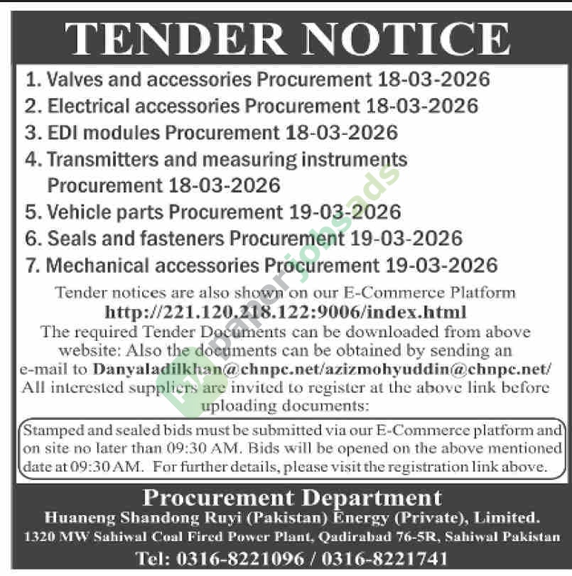 A private tender notice has been issued by Huaneng Shandong Ruyi (Pakistan) Energy (Private) Limited, Sahiwal. The bid submission deadline is 18 March 2026. Originally published in Dawn on 25 February 2026.