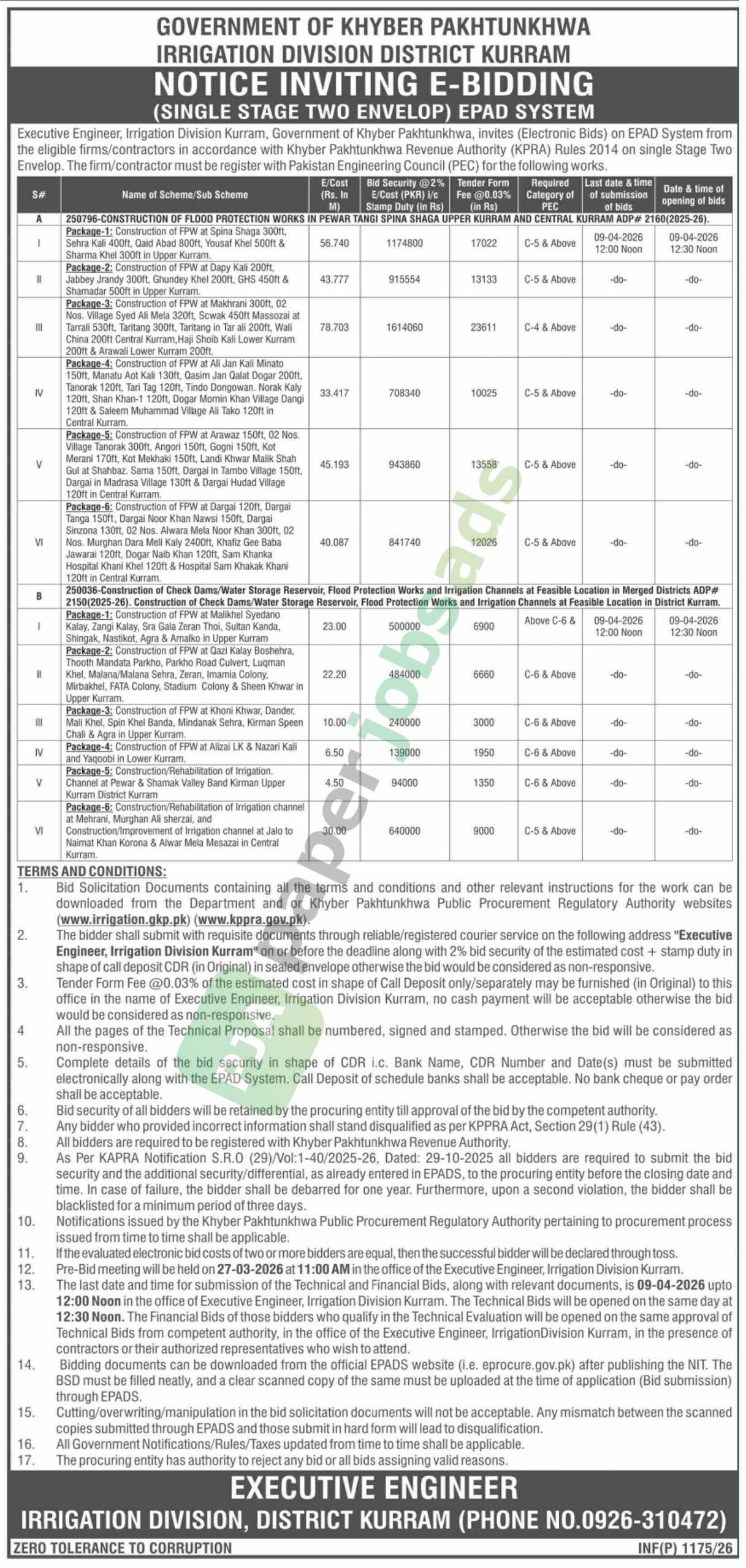 Executive Engineer, Irrigation Division Kurram, Government of Khyber Pakhtunkhwa, invites (Electronic Bids) on EPAD System from
