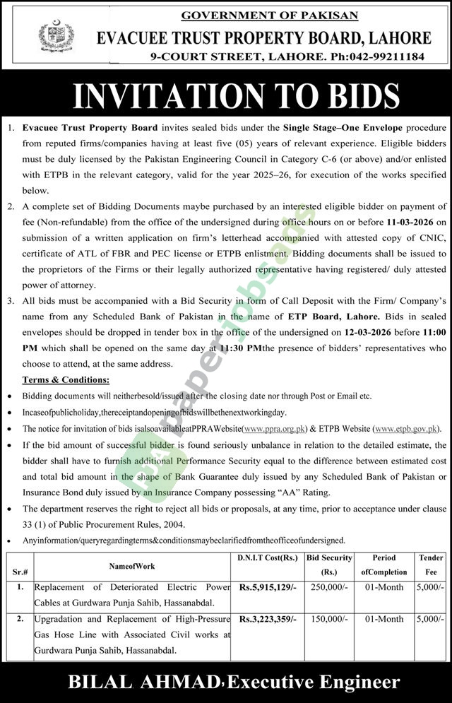 A government tender notice has been issued by Evacuee Trust Property Board, Lahore. The bid submission deadline is 12 March 2026. Originally published in The Nation on 25 February 2026.