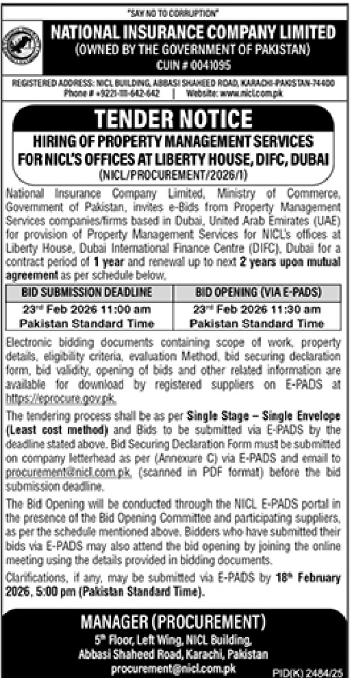 Tender Notice – NATIONAL INSURANCE COMPANY LIMITED – Karachi