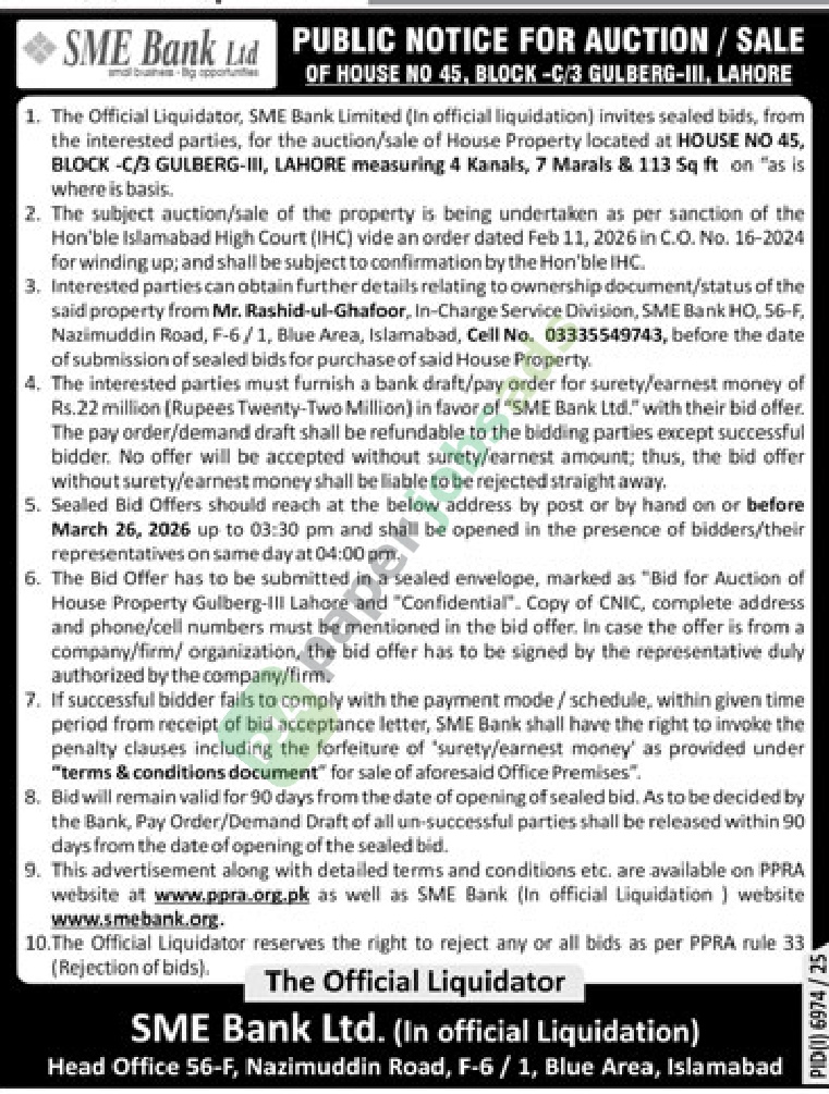 website at www.ppra.org.pk as well as SME Bank (In official Liquidation) website
