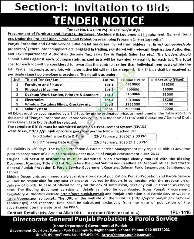 A government tender notice has been issued by Punjab Probation and Parole Service, Lahore. The bid submission deadline is 23 February 2026. Originally published in The Nation on 7 February 2026.