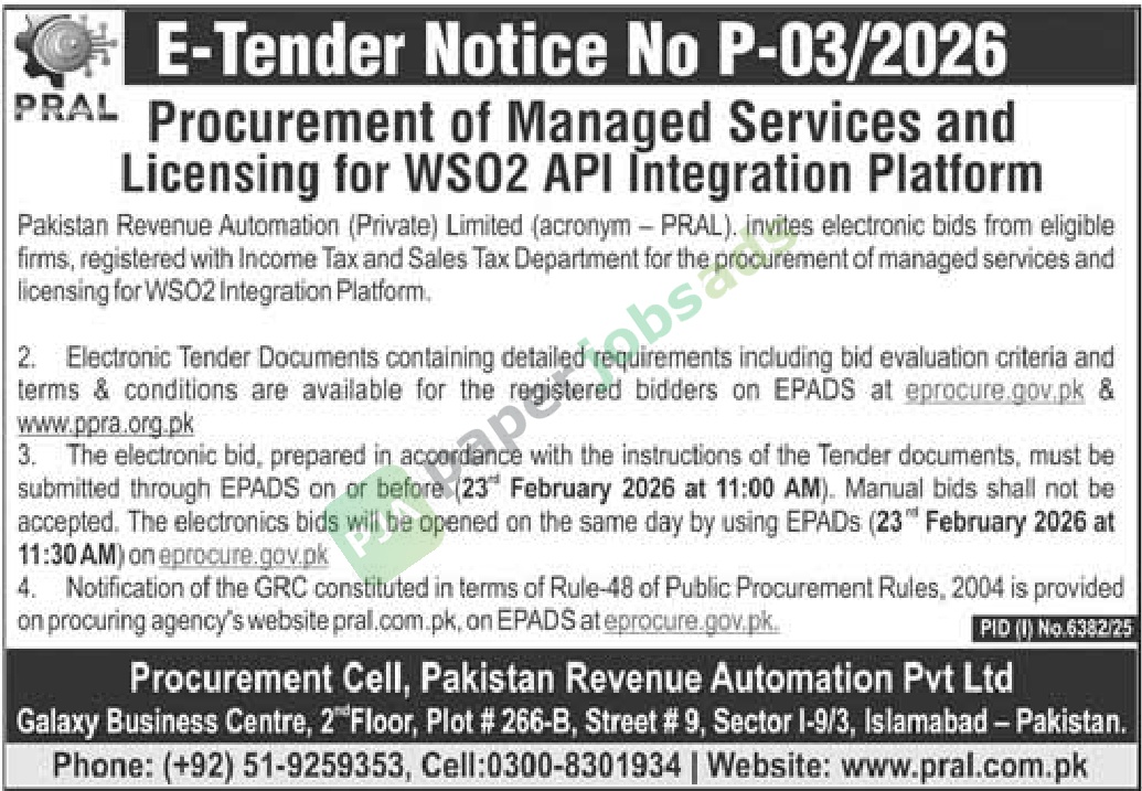 Pakistan Revenue Automation (Private) Limited (acronym – PRAL). invites electronic bids from eligible