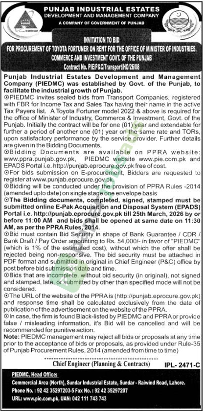 A government tender notice has been issued by Punjab Industrial Estates Development and Management Company (PIEDMC), Lahore. The bid submission deadline is 25 March 2026. Originally published in The Nation on 8 March 2026.