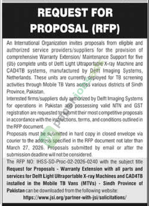 A ngo tender notice has been issued by JSI, Karachi. The bid submission deadline is 27 March 2026. Originally published in Daily Jang on 8 March 2026.